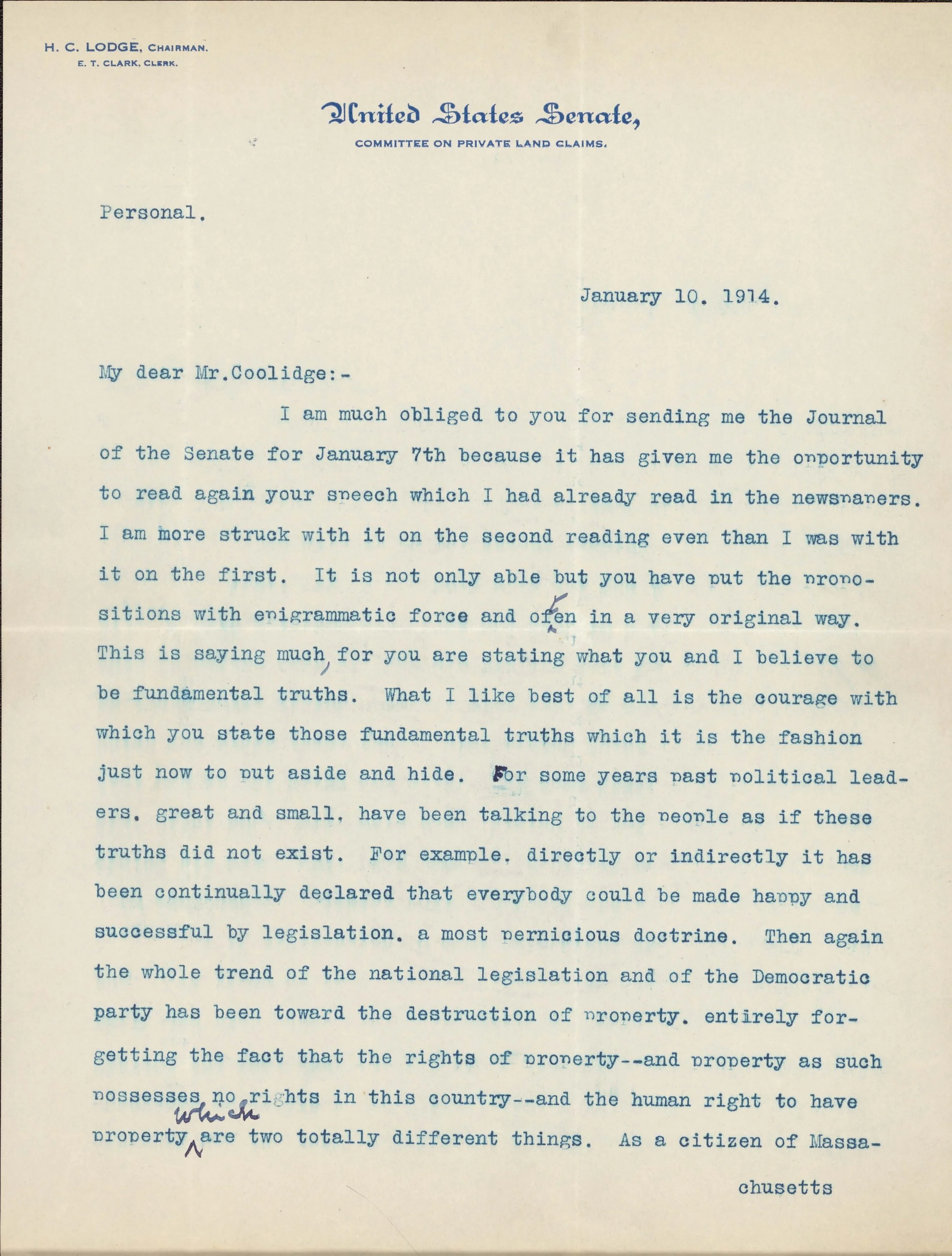Sen. Henry Cabot Lodge to State Sen. Calvin Coolidge: January 10, 1914.
