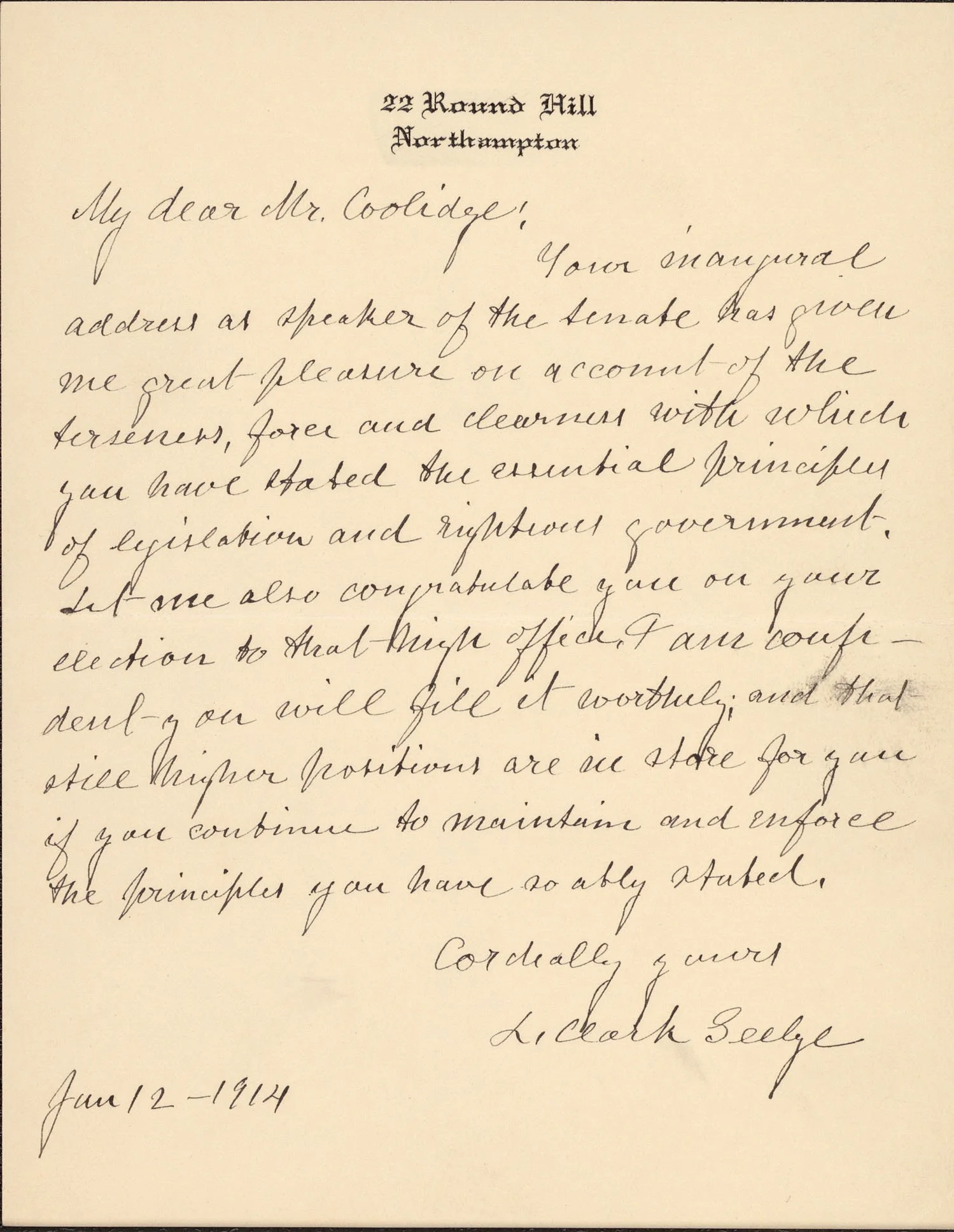 In this letter, President Seelye of Smith College praises Coolidge’s recent “Have Faith in Massachusetts” speech. Seelye, Smith’s first president and a former professor at Amherst, praises Coolidge’s clarity and brevity, as well as the strength of the message itself. He predicts that Coolidge will rise yet further in political office if he sticks to the principles outlined in this speech.