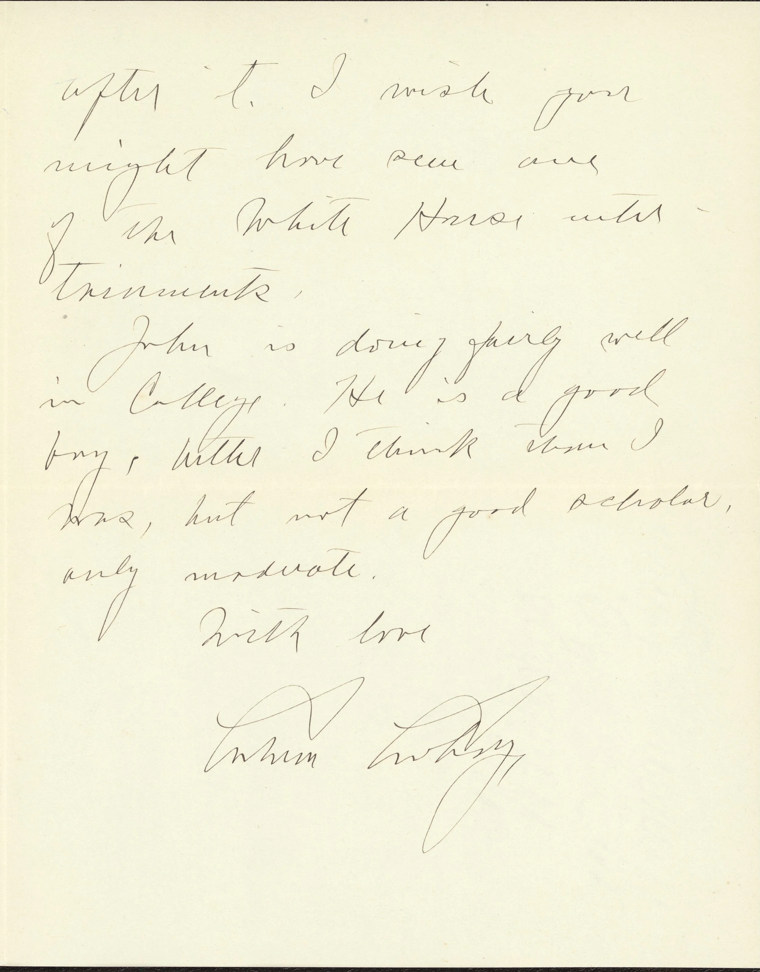 Coolidge finishes the letter with a comment on son John, who was starting the second half of his sophomore year at Amherst, writing, “He is a good boy, better I think than I was, but not a good scholar, only adequate.” In a 1999 interview for C-SPAN, Mr. Coolidge said that his brother, Calvin, Jr. was a “brilliant boy” and that “he was a better scholar than I was.”