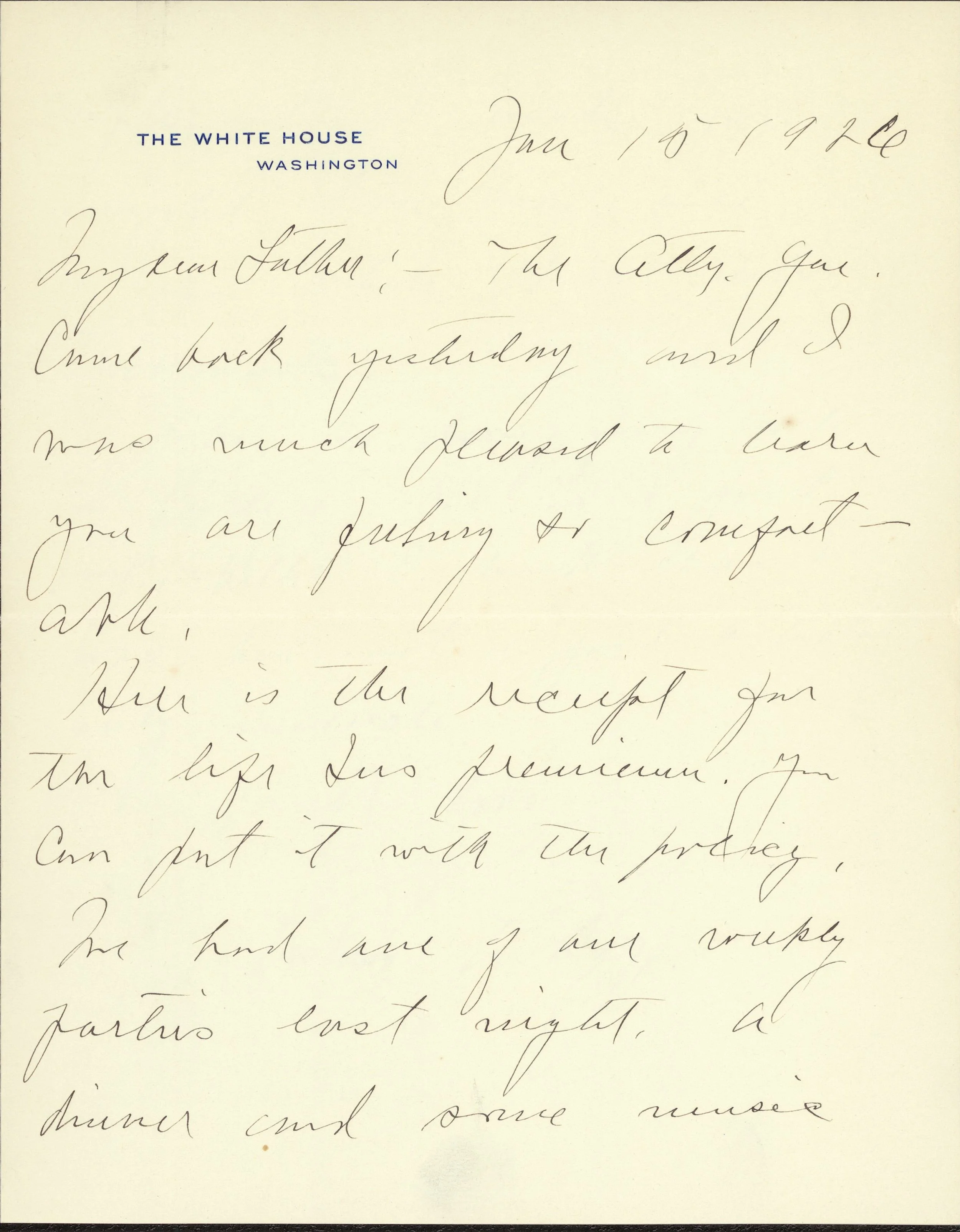 Coolidge notes that they “had one of our weekly parties last night. A dinner and some music after it.” The Washington Post reported on January 15, “The President and Mrs. Coolidge entertained at dinner last evening at the White House in honor of the Supreme Court. The table was decorated with white carnations, baby primula and maidenhair fern… A musical program in the East room followed the dinner.” Coolidge says of such events in his Autobiography that “these functions were so much in the hands of Mrs. Coolidge that oftentimes I did not know what guests were to be present until I met them in the Blue Room just before going in to dinner. These social events are almost as much a part of the life of official Washington as a session of the Congress or a term of the Supreme Court.”