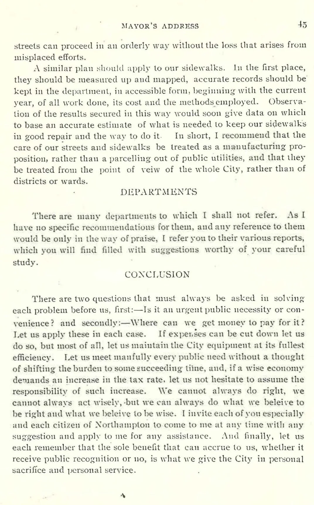 In this speech, Coolidge shows his civic pride for Northampton, his attention to detail, and his appreciation for economy. He expresses broad satisfaction with most of Northampton’s municipal affairs, crediting the city and its people for its good government. He also outlines two principles of government that he would maintain throughout his career. First, that it must be determined whether an issue is of urgent public necessity or convenience before planning to solve it, and, second, that any new solution must be funded without waste or debt.