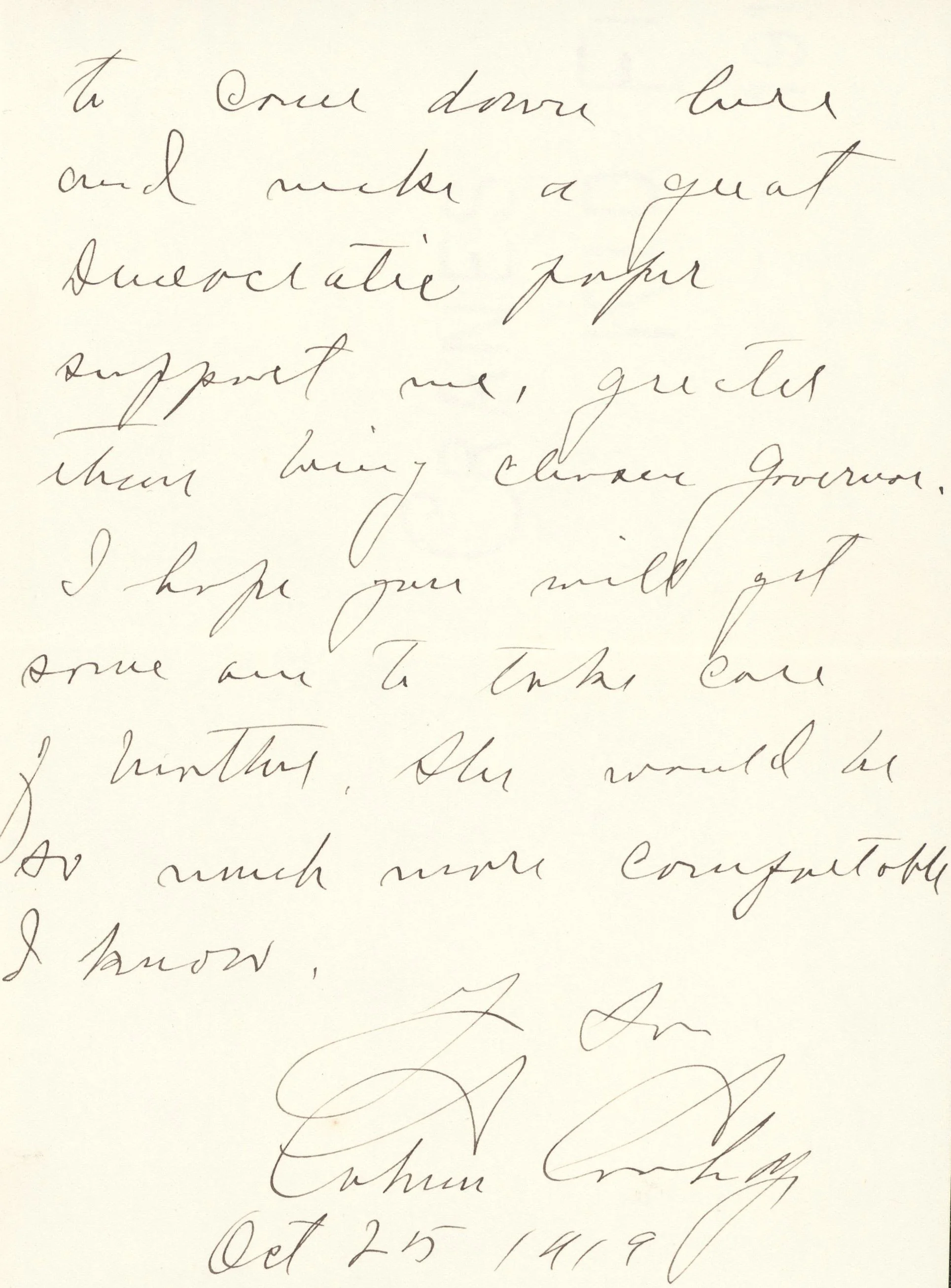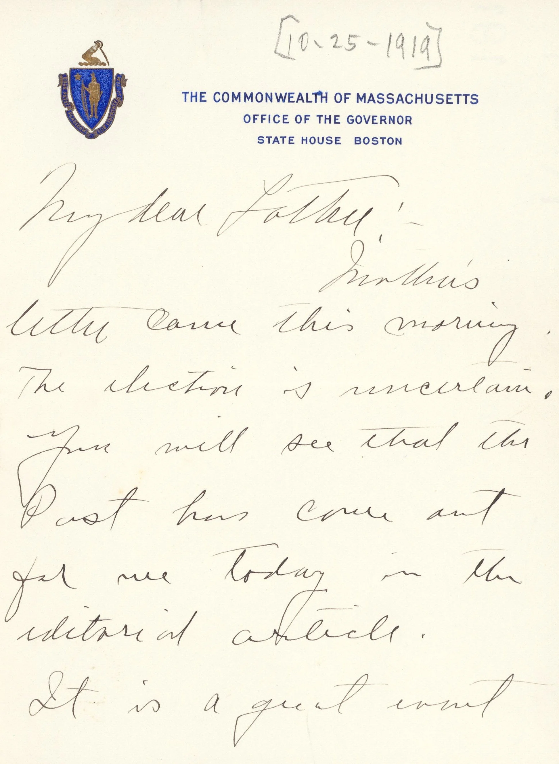 Calvin Coolidge writing his father, 10 days before the Massachusetts gubernatorial election: October 25, 1919.