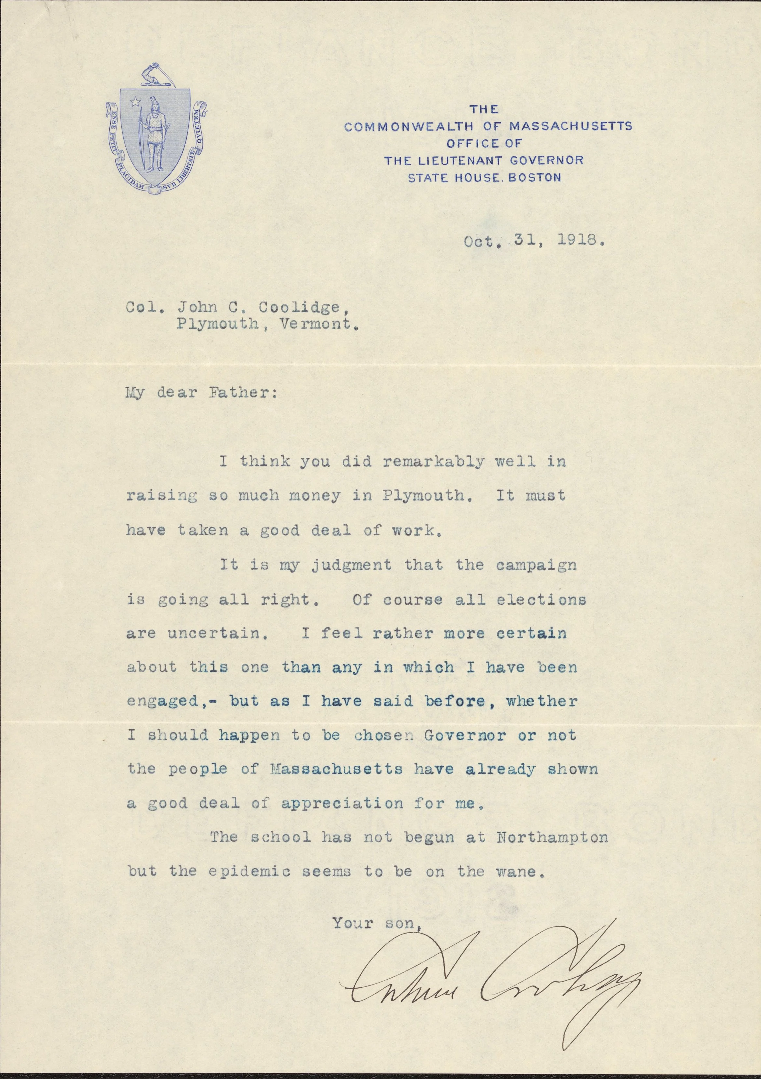 Calvin Coolidge writing to his father in the waning days of the gubernatorial campaign: October 31, 1918.