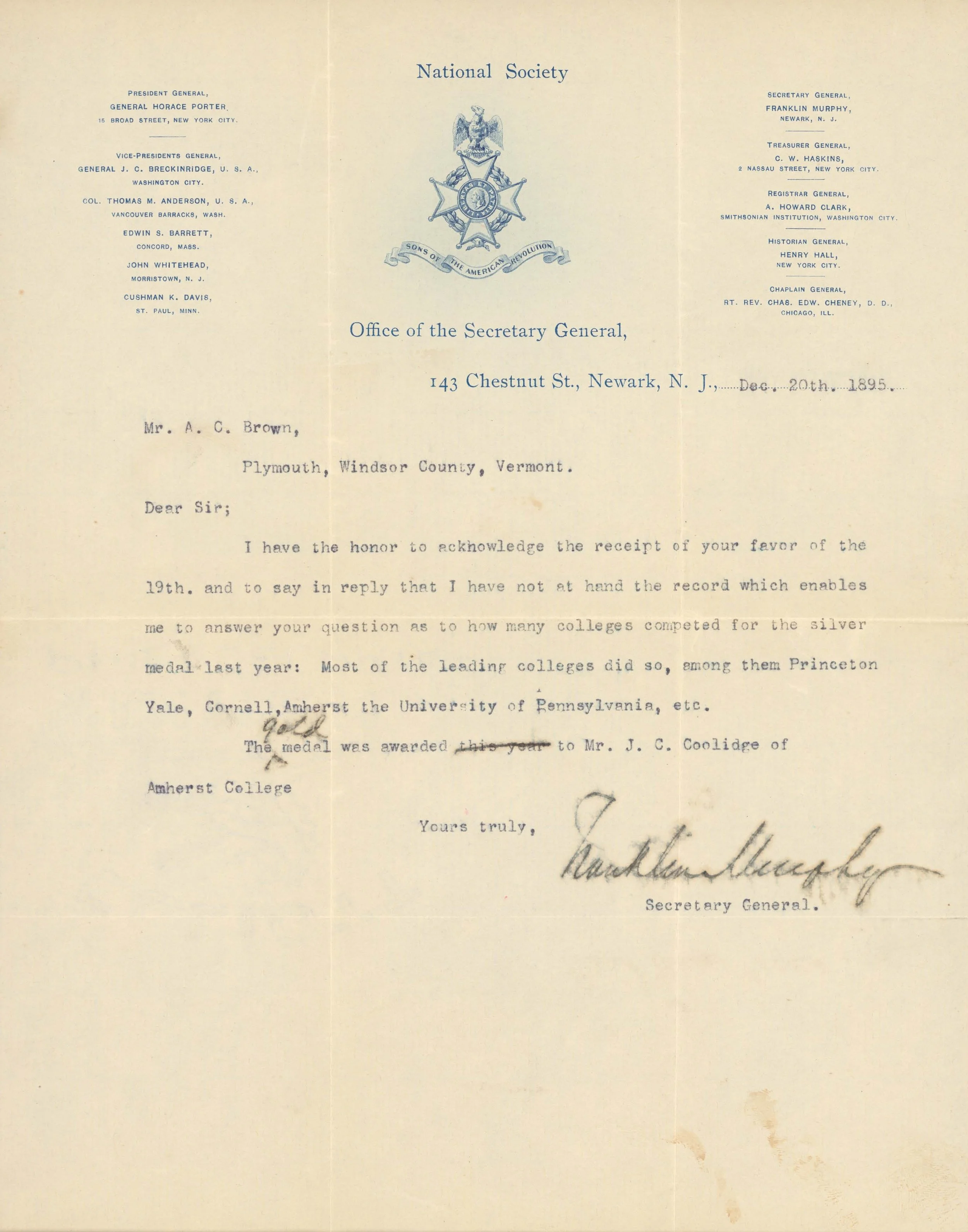 This letter describes the Sons of the American Revolution essay contest. It reports that the gold medal was won by Calvin Coolidge that year.