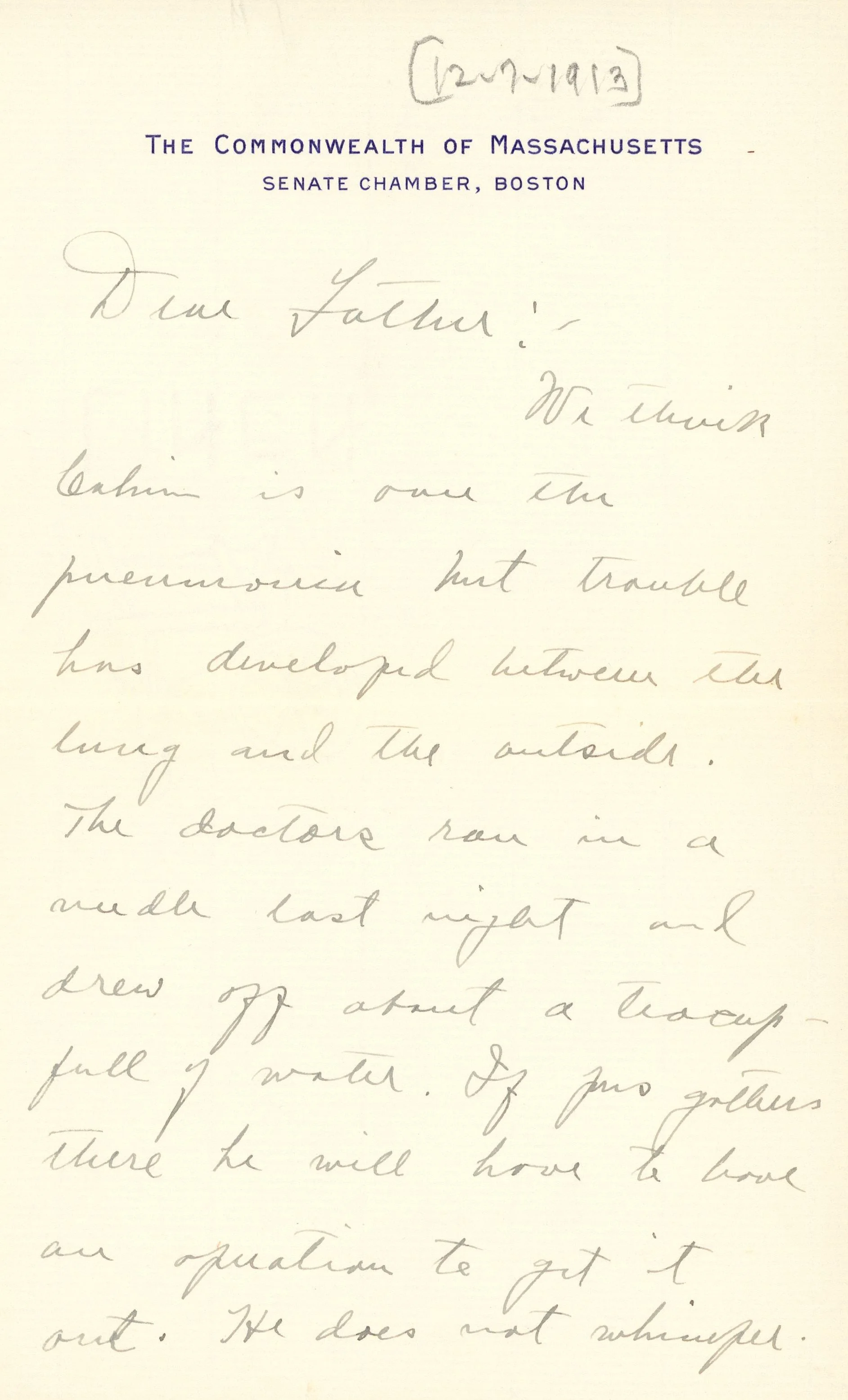 Coolidge updates his father on a health scare that Calvin Jr. is undergoing; pneumonia, and other issues with his lungs, are causing the boy to become very frail and weak. Coolidge notes that, if his condition worsens, an operation might be necessary. Calvin shows substantial pride in his son, saying that he is facing his illness with strength and courage.