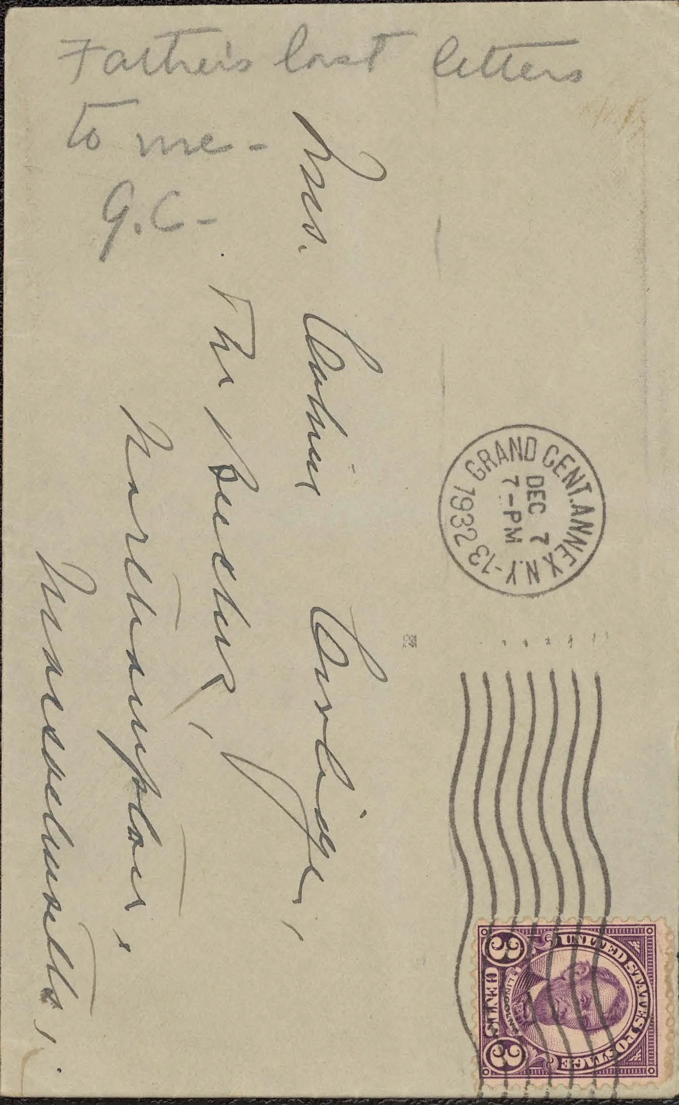 On the envelope, Grace wrote, “Father’s last letters to me. G.C.,” referring to the letters dated December 7 and 8. Coolidge died suddenly on January 5, 1933. The letter was written on the same day as the previous letter, and Coolidge hopes “Timmie was glad to see his cousin’s picture.” This is a reference to the resemblance between the Coolidges’ red chow, Tiny Tim, and a picture of a red panda Coolidge sent earlier that day.