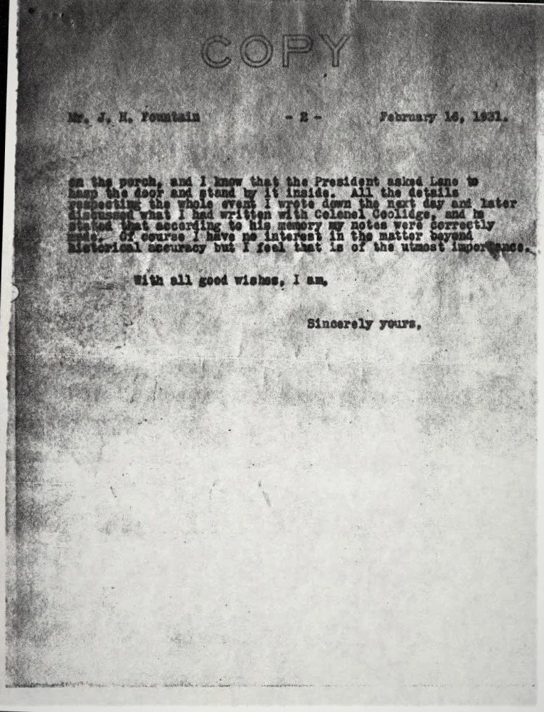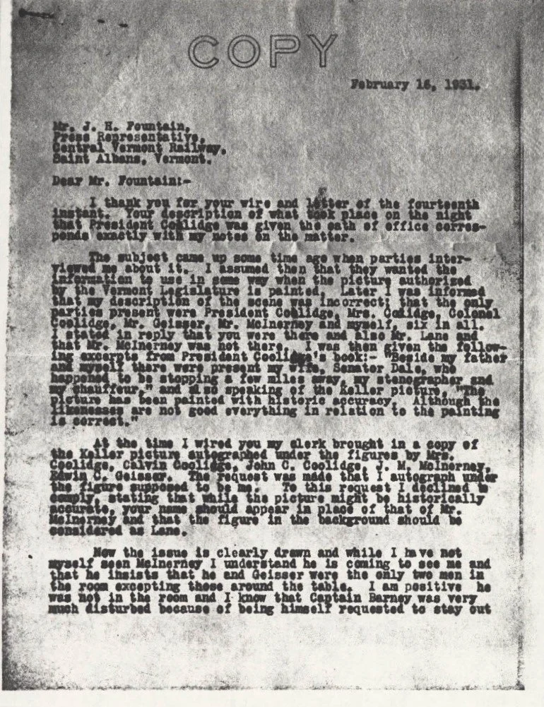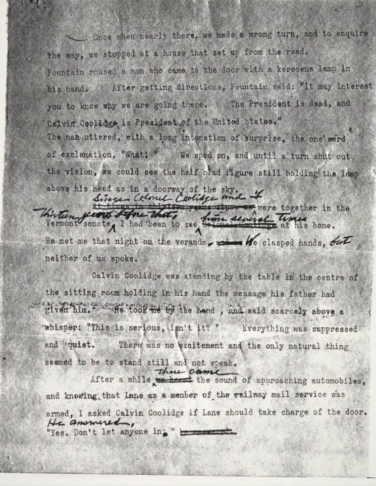 This series of documents details the method by which Vermont historical researchers attempted to piece together Porter Dale’s account of Coolidge’s inauguration in August of 1923. As with many events of this nature, the exact recollection differed with the teller. Yet across all accounts, the drama and solemnity of the moment is universal.