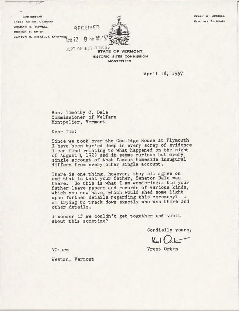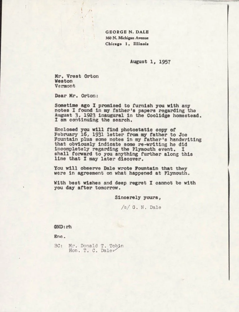 Correspondence detailing the Homestead Inauguration of Calvin Coolidge: 1931, 1957 et. al.
