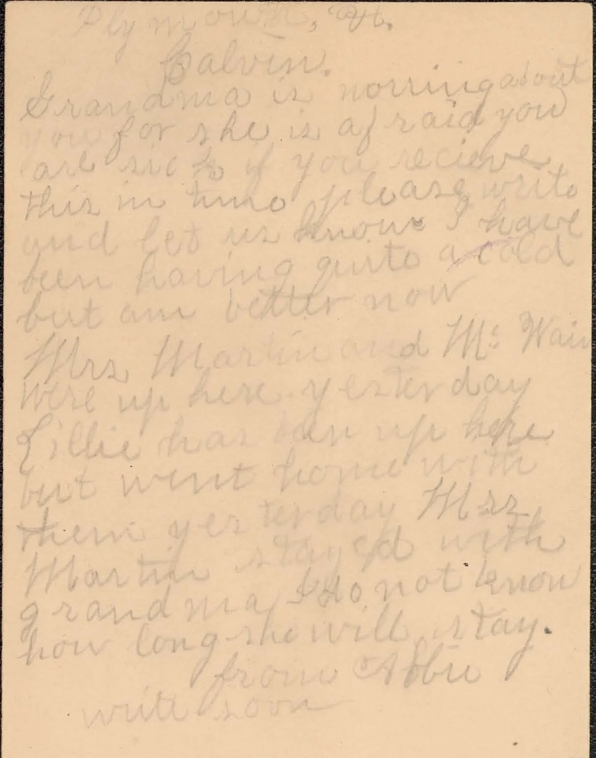 Abbie describes Calvin’s grandmother fretting about his health, noting that she herself has recently had a cold and asks him to write them to assure them that he is well. She also describes recent visits with neighbors.