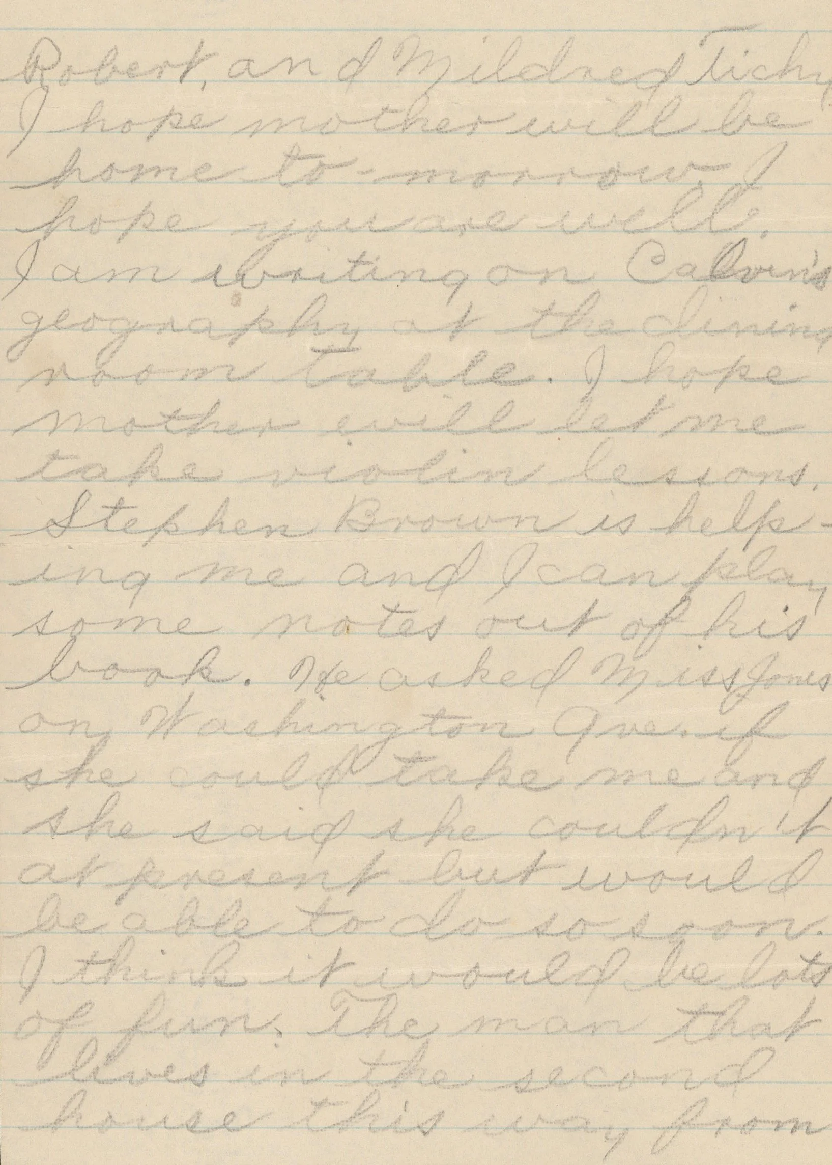 John goes on to express to his father his desire to take violin lessons. Although Coolidge himself played nothing more than the harmonica, Grace took piano lessons as a young girl and was adept at playing. She must have said “yes” to lessons as both John and Calvin, Jr. do later learn to play the violin. Coolidge’s uncle, John Wilder, was an accomplished “fiddle” player. “Uncle John” organized the “Wilder Quadrille Band” which, according to the Burlington Free Press, “was one of the best known musical organizations in the state. Governors and their councilors danced to its music as well as artisans and farmers.”