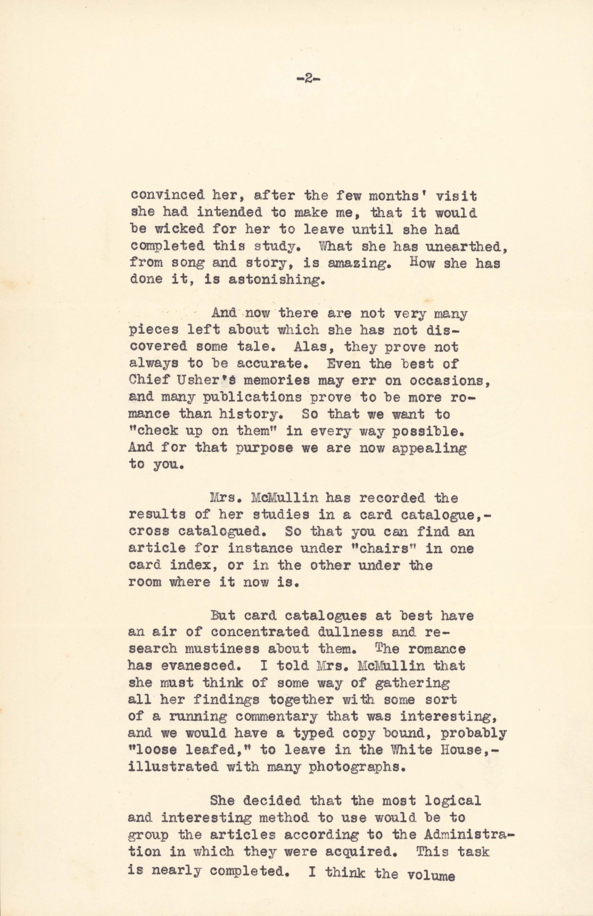 In this letter, Lou Hoover asks Grace if she can help demystify the origins of some White House furniture. Mrs. Hoover was attempting to locate the origins of the White House’s furniture, but found that there were no records for many of pieces in the collection. There were, however, some pieces linked by name to the Coolidges, so she asks Grace for assistance in identifying the provenance of these pieces. The two first ladies had been friends since Calvin’s vice presidency, even adopting pet names for each other in their correspondence. The Mrs. McMullin in the letter refers to Dare Stark McMullin, a friend of Mrs. Hoover’s.