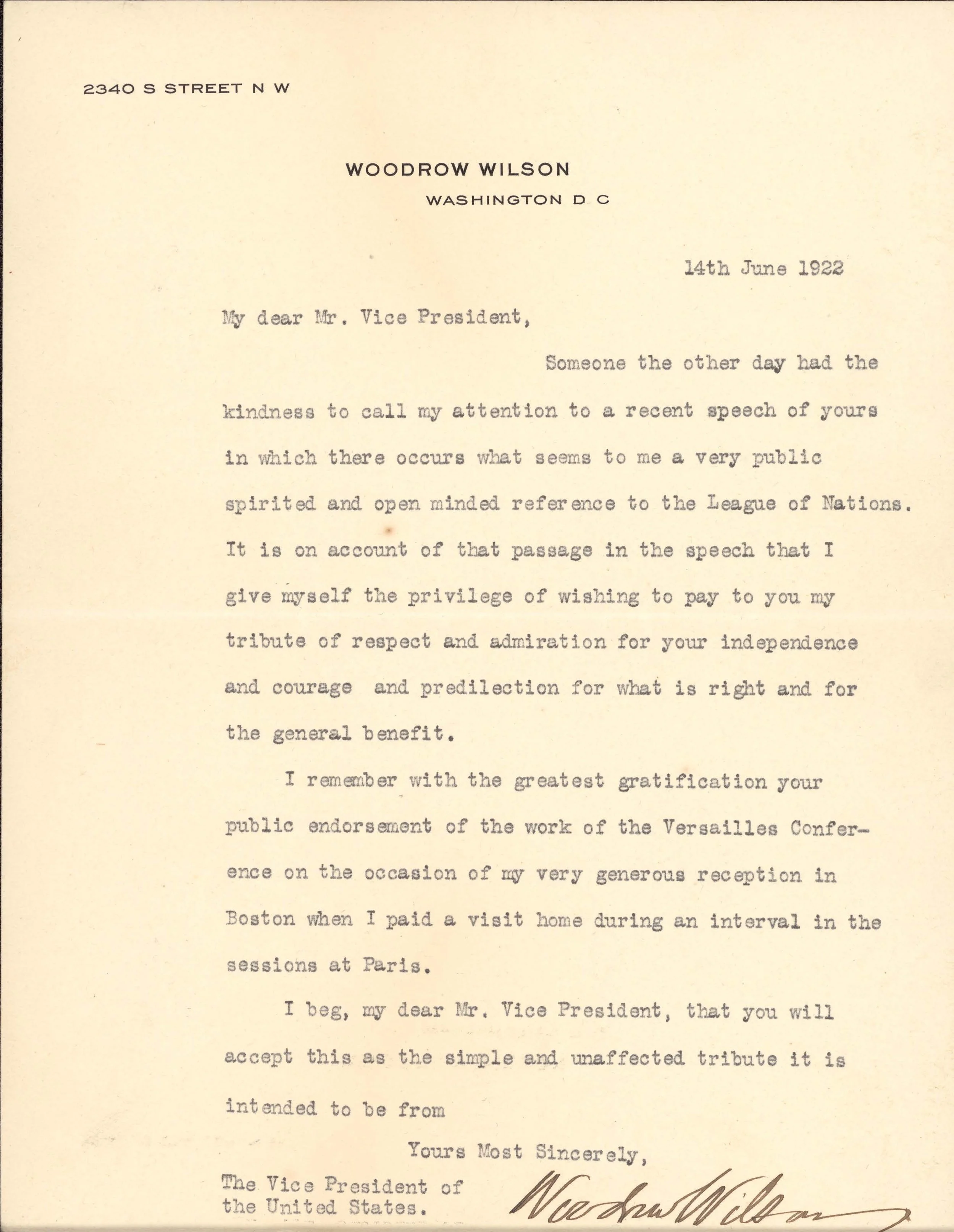 Woodrow Wilson writing to Vice President Calvin Coolidge: June 14, 1922.
