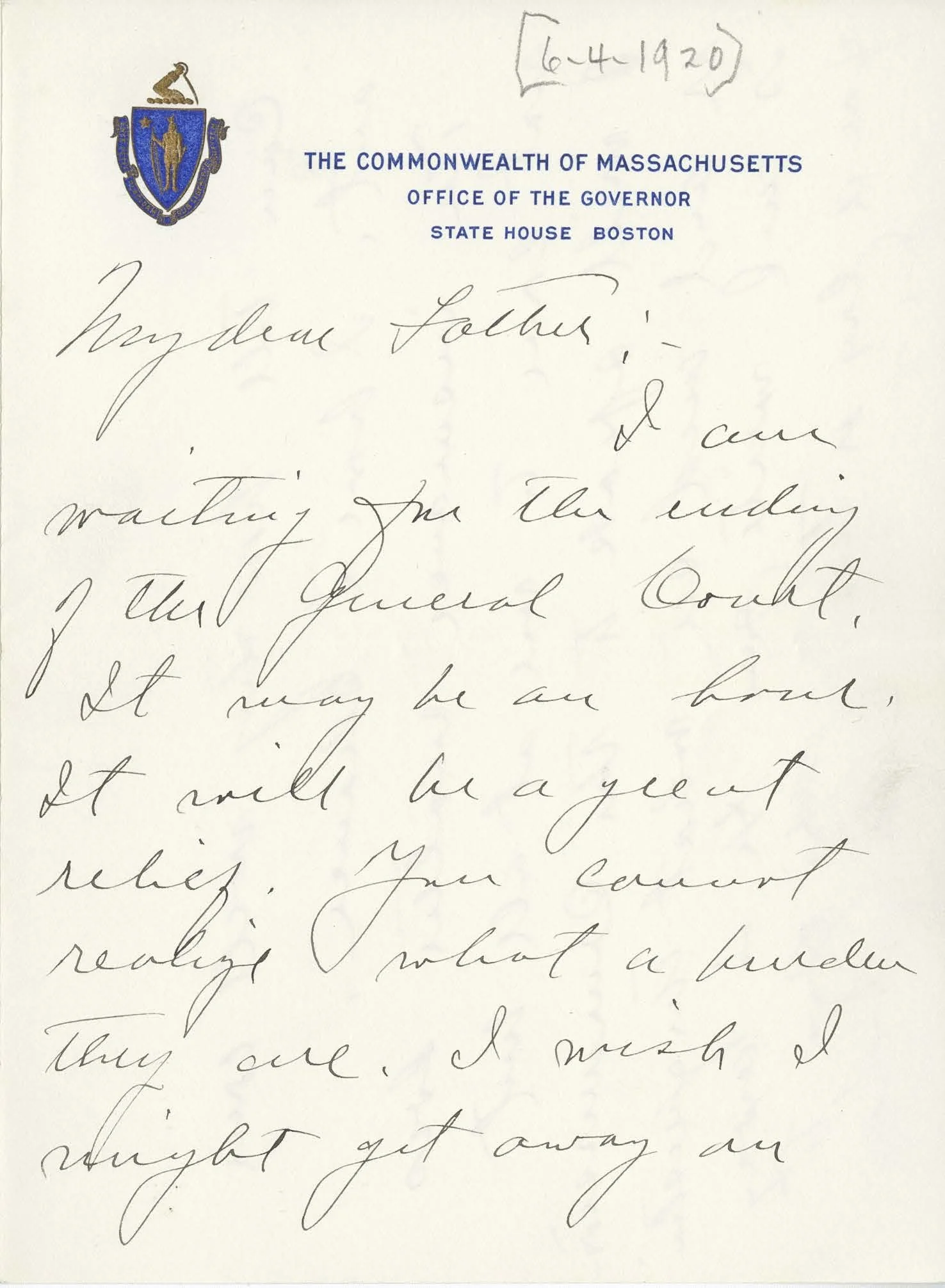 Coolidge writes at the end of the 1920 session of the Massachusetts General Court and the beginning of the Republican National Convention. On the members of the General Court, Coolidge says to his father, “you cannot realize what a burden they are.” Coolidge will have to wait until 1:30 am on June 5 to prorogue the Court. The Boston Daily Globe said, “The calendar day passed before it was possible to complete the business in hand.” Coolidge signed many bills but did veto a bill calling for a raise for county employees. This was not because of the raise per se, but because Coolidge saw the raise by the legislature as a usurpation of the rights of county commissioners.