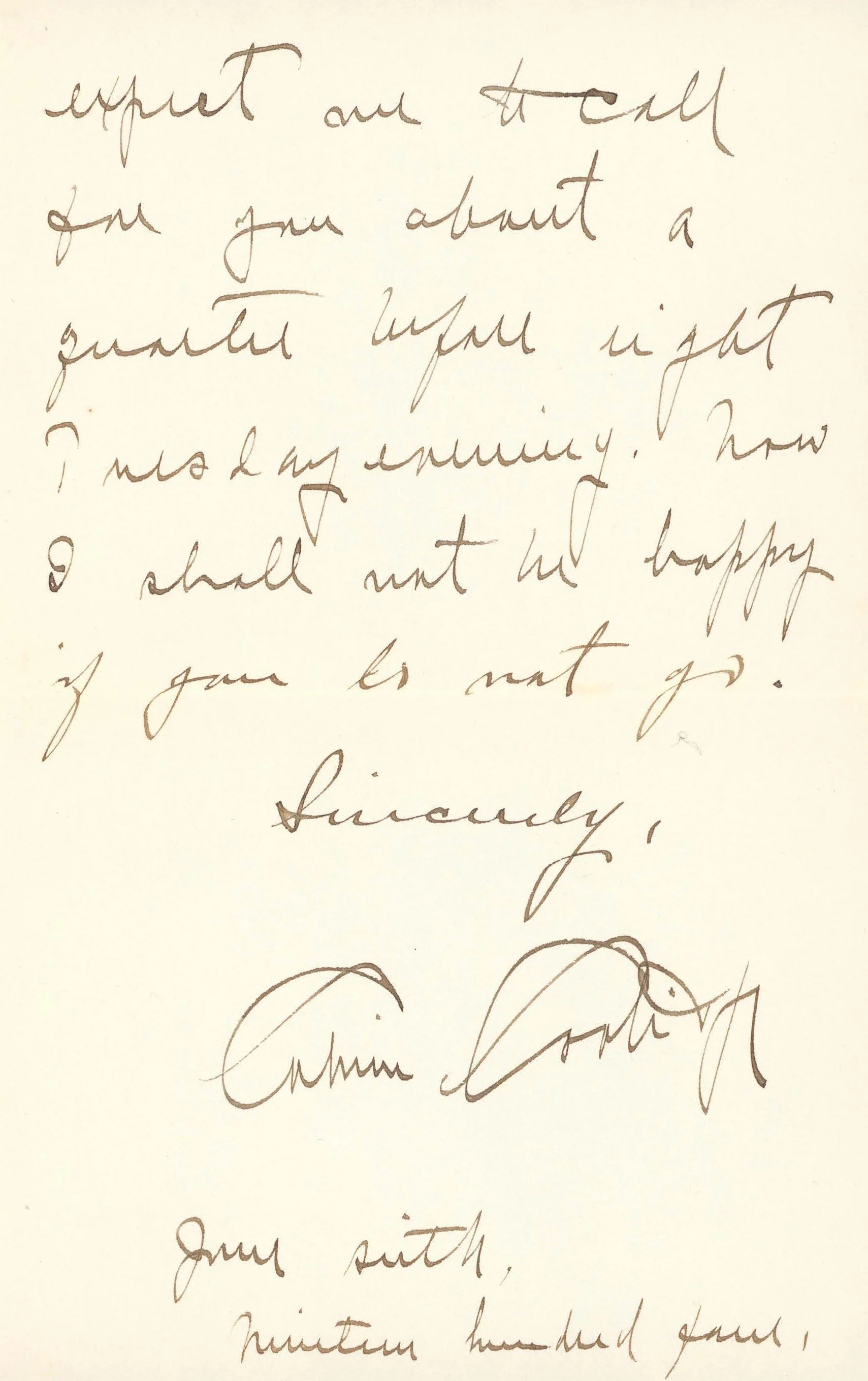 The young lawyer Coolidge lived near the Clarke School for the Deaf in Northampton, Massachusetts. At the time, Grace Anna Goodhue, a young teacher, lived nearby. Grace spotted Calvin through a window, shaving with a derby hat on the back of his head to hold down part of his hair. The next part of the story is not clear: either he pursued her after she laughed at his shaving outfit, or she asked a janitor to deliver a flower in a pot to Calvin. In this letter, Calvin asks Grace about whether or not she would join him at the Colonial Reception and Ball, an event requiring “colonial style” dress. “How I shall not be happy if you do not go.”