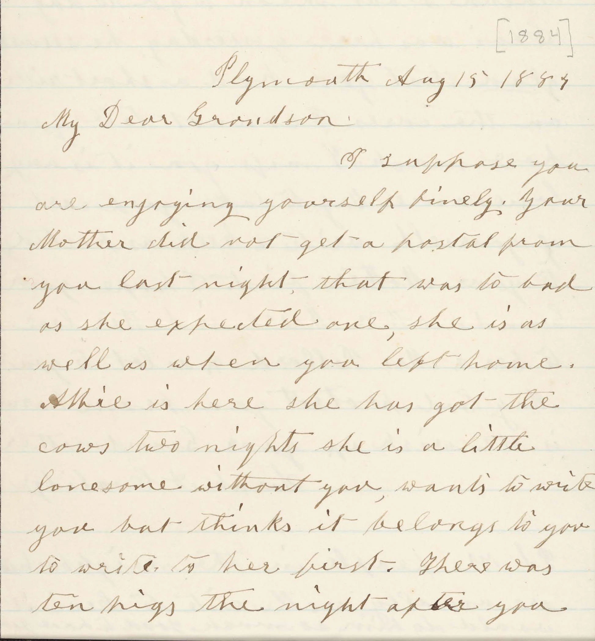 Grandmother Coolidge writes Calvin, updating him on the goings-on in Plymouth. She admonishes him to write his mother and sister, saying that they are both expecting letters from him. Other topics include the status of the neighbors, livestock, and a report of three stillborn piglets.