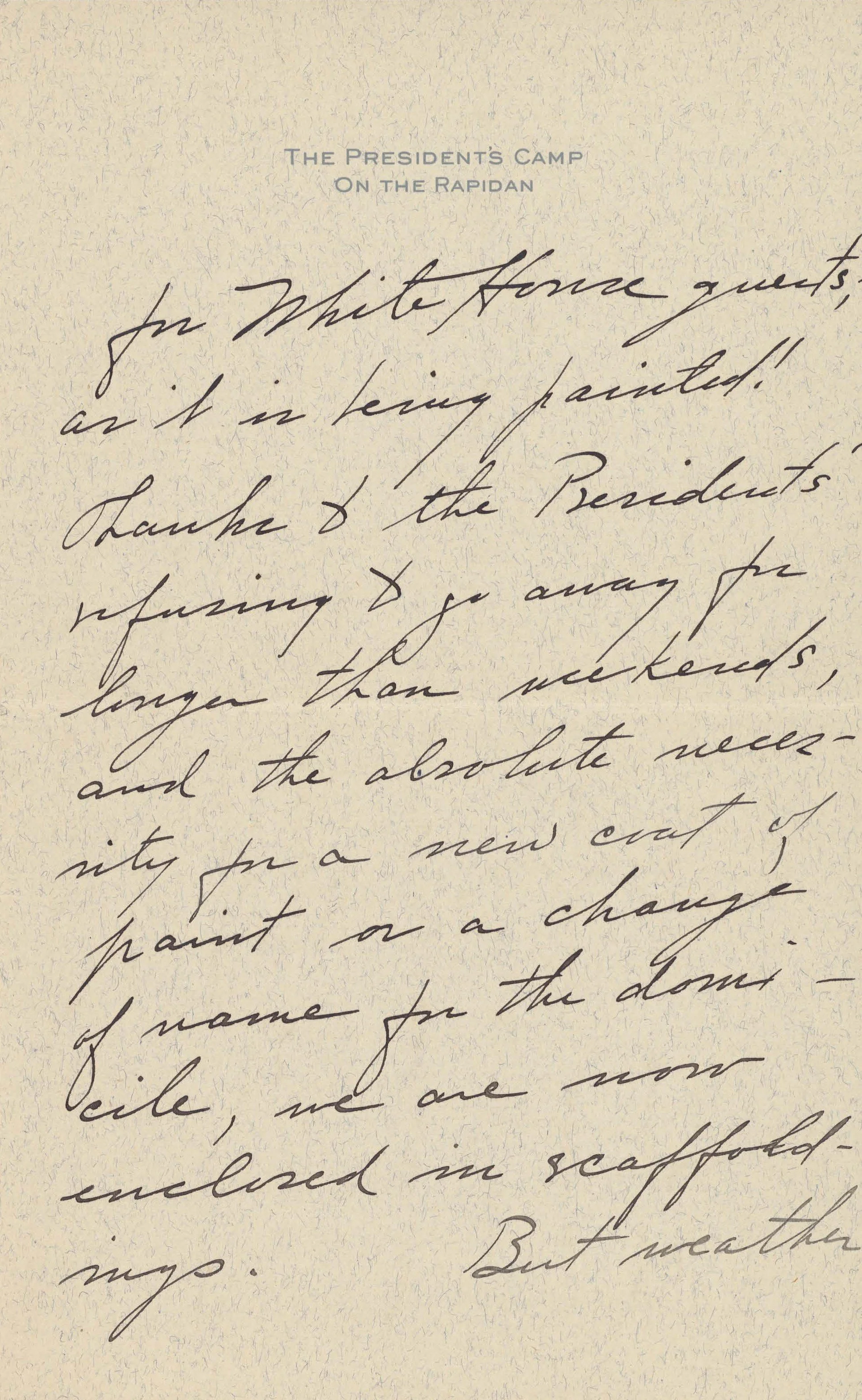 The letter is written on “The President’s Camp on the Rapidan” stationery. Herbert Hoover was the first president to use the “Rapidan Camp” in the Blue Ridge Mountains of Virginia as a formal presidential retreat. Franklin Roosevelt would later find the location too rugged for him to navigate and, in 1942, would establish “Shangri-La,” later known as Camp David, as a retreat in the mountains of Maryland.
