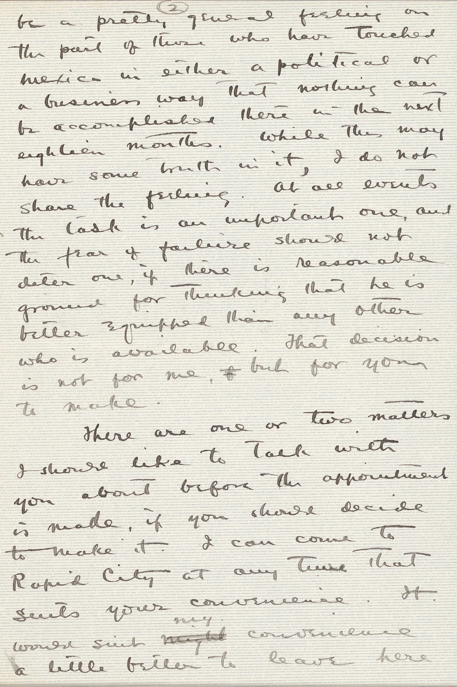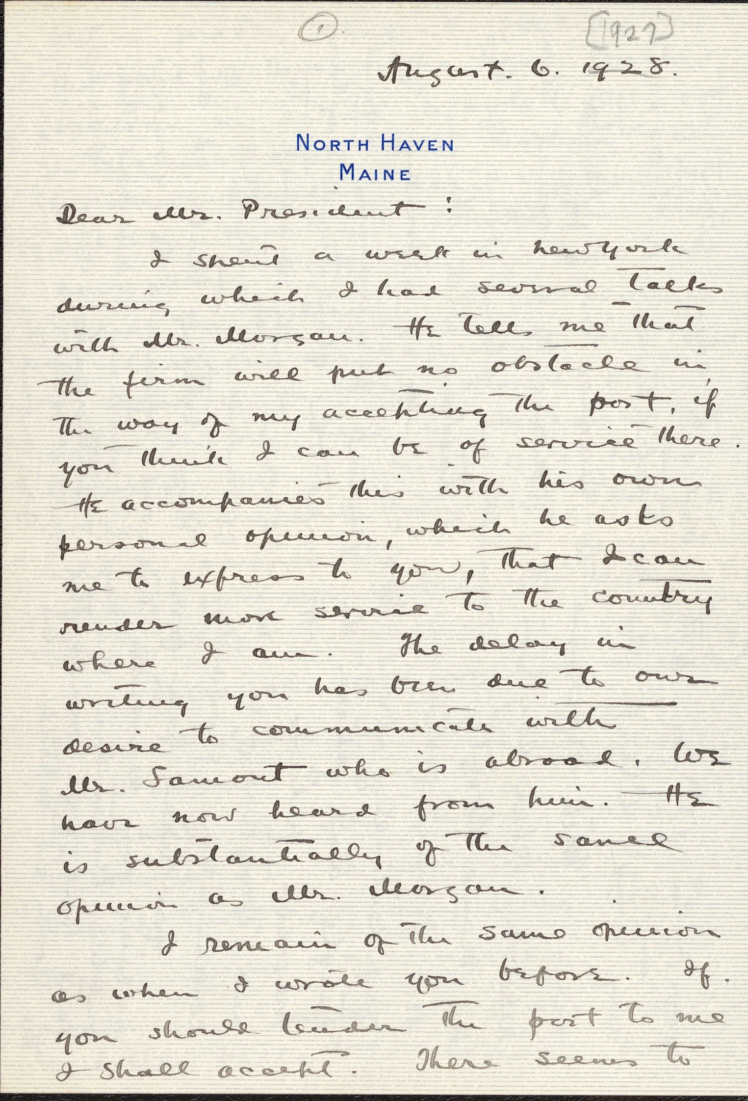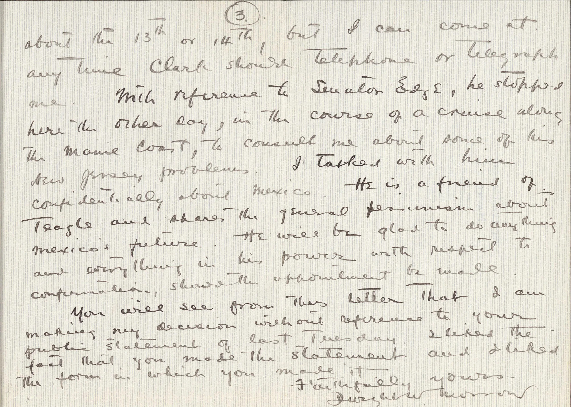 Dwight Morrow, Coolidge’s Amherst classmate, and, by now, a prominent figure on Wall Street, writes the president about Morrow’s potential diplomatic posting in Mexico. Morrow says that, if the position is offered, he will accept. Morrow expresses optimism that he could improve Mexican-American relations, contrary to the more pessimistic opinion of other Americans. At the time, Mexico was in turmoil. The country had been engulfed in revolution and civil war for more than a decade. Morrow would serve as ambassador to Mexico starting later that year.