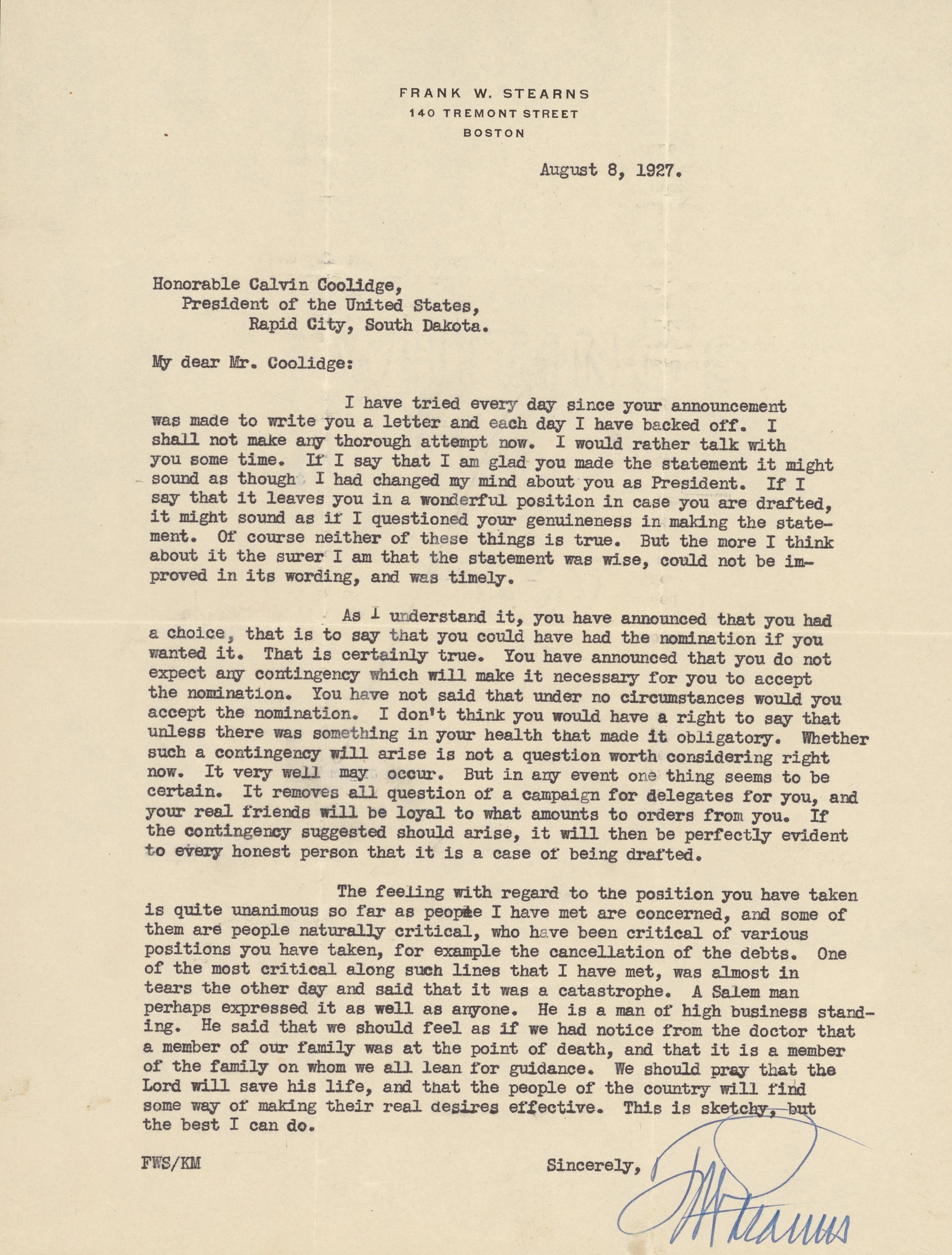 Longtime Coolidge friend Frank Stearns writing to Calvin Coolidge: August 8, 1927.