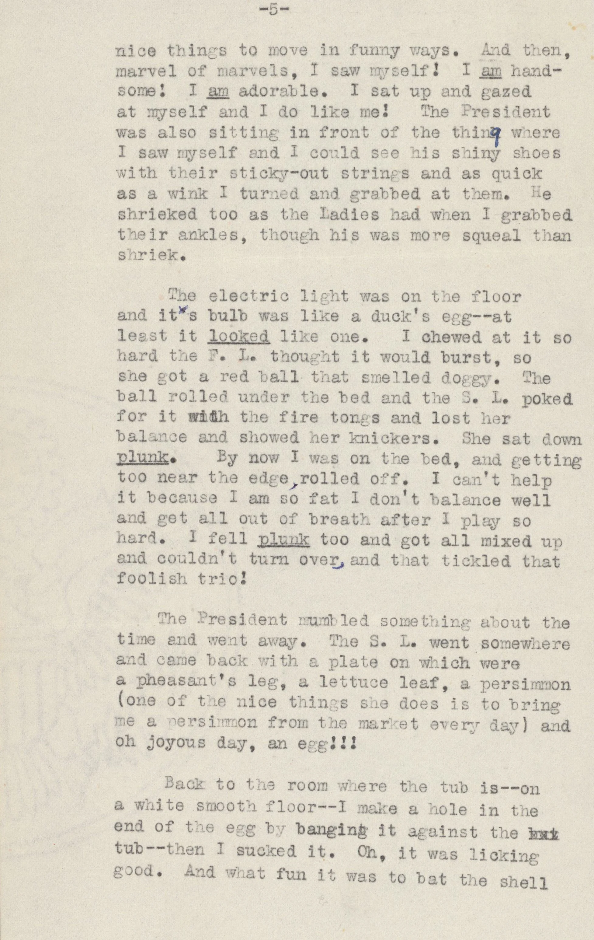 This is a humorous story written by White House housekeeper Ellen Riley detailing the arrival of Rebecca Raccoon. Riley writes from the raccoon’s perspective. Rebecca had been sent from Mississippi to serve as part of the White House Thanksgiving dinner, but the Coolidge family decided to keep her as a pet instead. Riley describes Rebecca’s various antics, whereby she won the hearts of the first family and staff alike, even that of the “solemn-looking man”— Rebecca’s title for Coolidge.