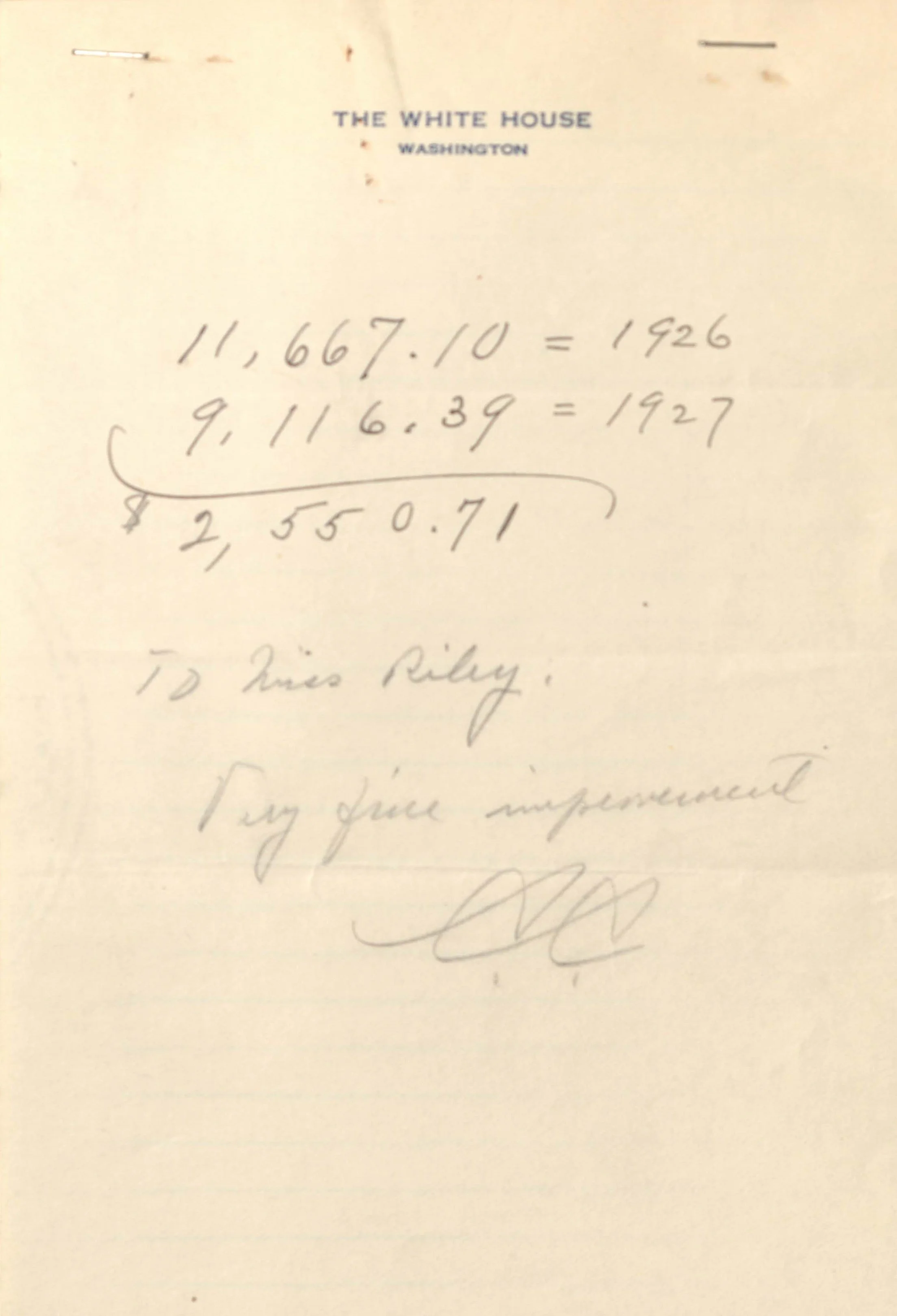 A note from Calvin Coolidge to Ellen Riley: undated.
